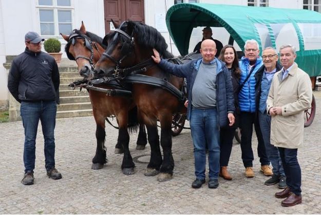 Mit den Kaltblütern Martell und Marius vor dem Kremser zeigte der langjährige Gestütstierarzt und Vorstandsmitglied Dr. Michael Köhler die historischen Gestütsgebäude und modernen Anlagen wie die EU-Besamungsstation, bevor es dann im Landstallmeisterhaus direkt an die Arbeit ging.